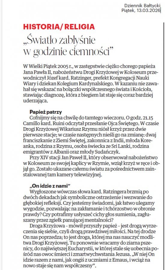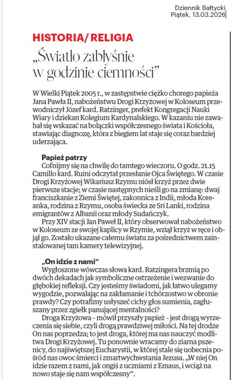 „Droga Krzyżowa. Proroczy głos z Koloseum” – w Dzienniku Bałtyckim z 13.03.2026