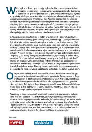 Wielu będzie zaskoczonych, czytając tę książkę. Nie zawsze spotyka się bowiem opinie tak odważne – formułowane zwłaszcza przez osobę duchowną – a zarazem tak głęboko przemyślane. O. prof. Dariusz Kowalczyk SJ wykazuje się wielką wiedzą na temat Kościoła, chrześcijaństwa, ale także aktualnych spraw społecznych i narodowych. W rozmowie z dr. Adamem Sosnowskim nie unika odpowiedzi na pytania najtrudniejsze i najbardziej kontrowersyjne: Jak Bóg może być miłosierny, jeśli dopuszcza wieczne męki w piekle? Czy naprawdę istnieje życie po śmierci – jeśli tak, to jakie? Jak zachować się wobec świata, który coraz częściej drwi z wiary, a katolików spycha na margines? Który grzech jest najcięższy? Jak pokonać własną obojętność, lenistwo duchowe, zniechęcenie i strach?
