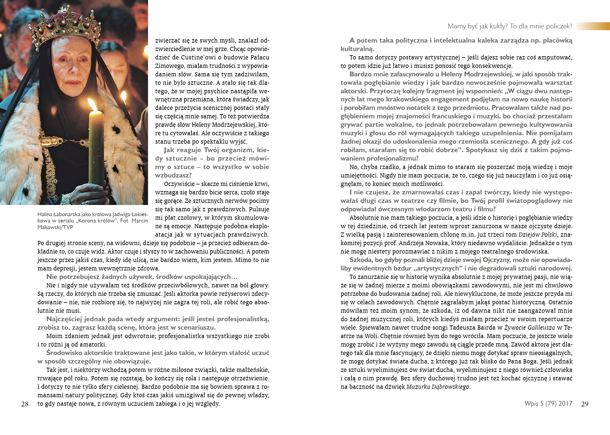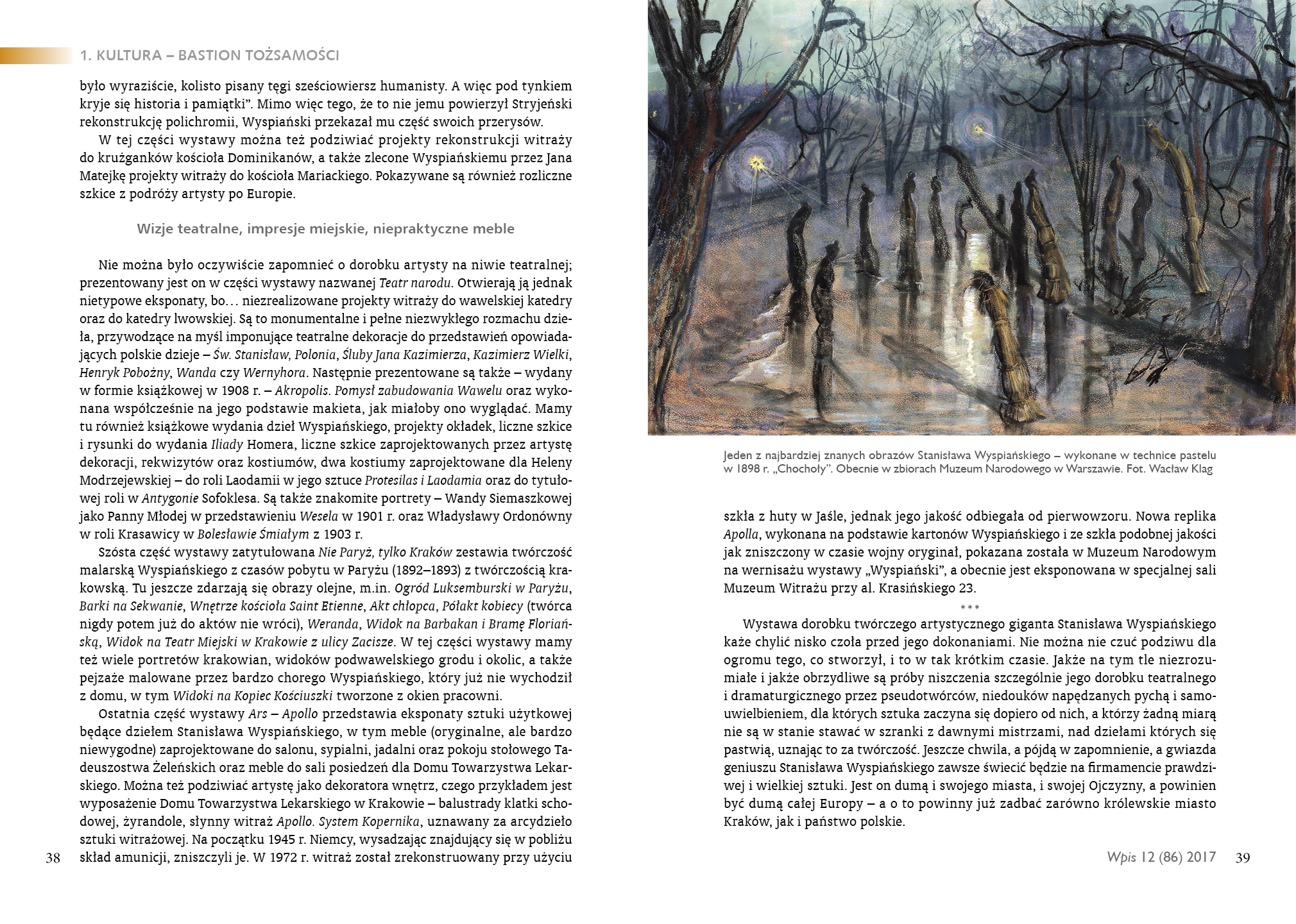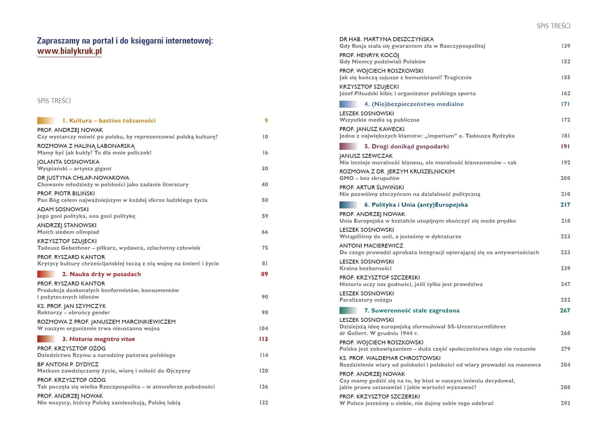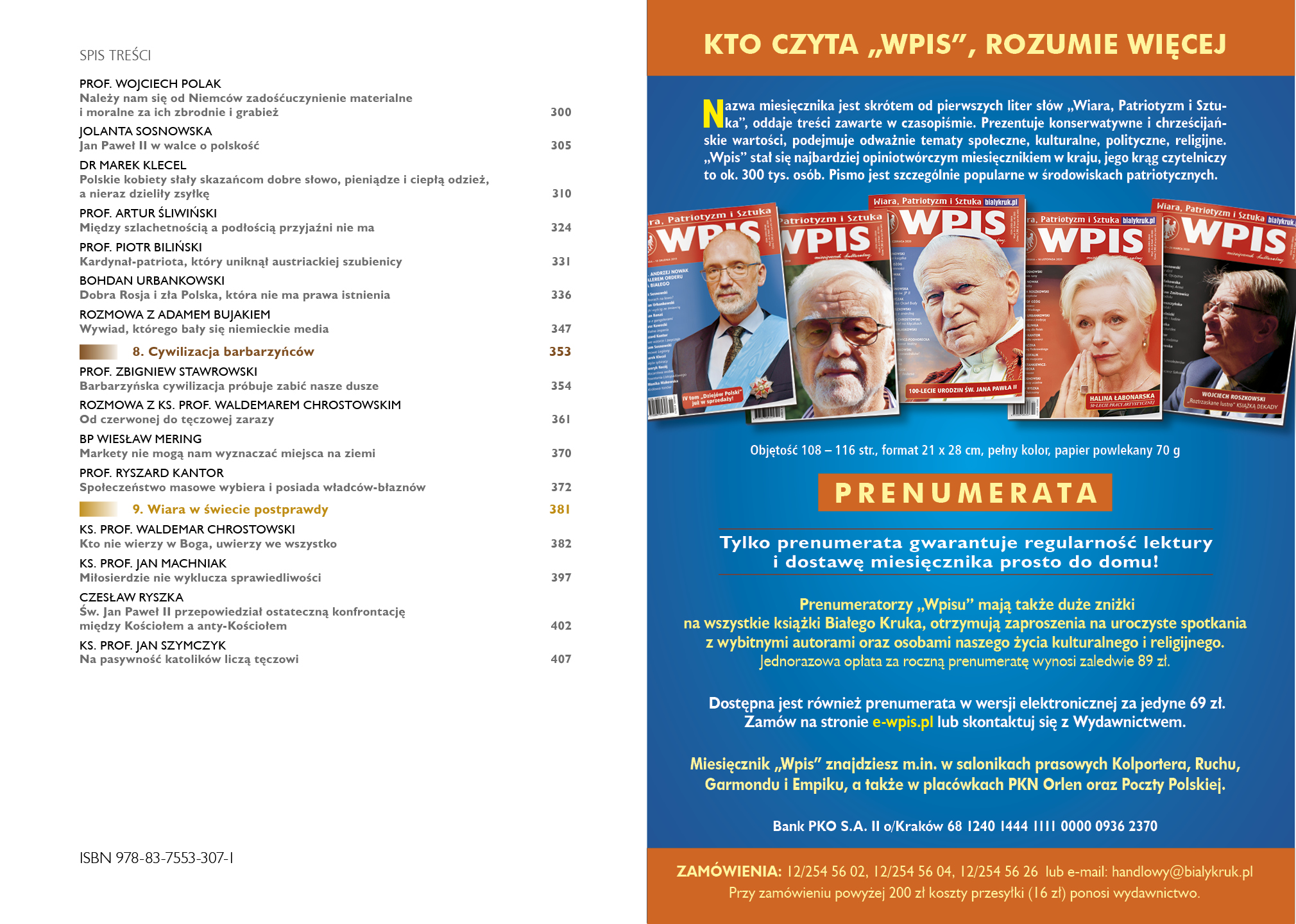Bogactwo publicystyki miesięcznika kulturalnego „WPiS. Wiara, Patriotyzm i Sztuka” jest olbrzymie. Prezentowana tu antologia zawiera wybrane eseje, artykuły i rozmowy 30 autorów z okresu 2016 – 2019. To tylko mały, ale reprezentatywny wycinek dorobku miesięcznika, który w tym roku świętuje 10-lecie istnienia. Łamy czasopisma zapełniali od początku tacy wielcy twórcy, jak Adam Bujak, ks. prof. Waldemar Chrostowski, Antoni Macierewicz, profesorowie Janusz Kawecki, Andrzej Nowak, Krzysztof Ożóg, Wojciech Roszkowski, Krzysztof Szczerski oraz przenikliwi publicyści tacy jak Czesław Ryszka, Leszek Sosnowski czy Janusz Szewczak.