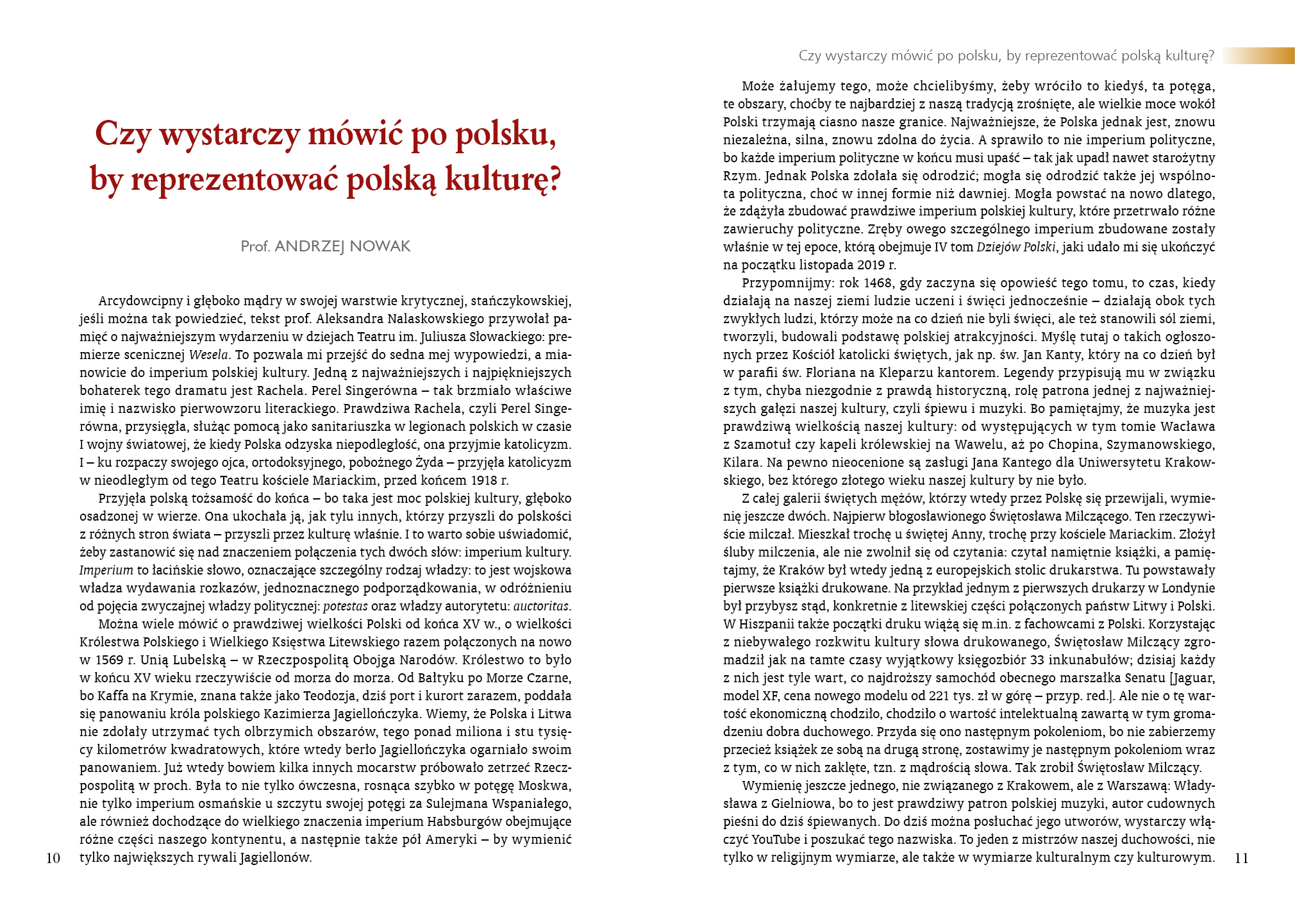 Arcydowcipny i głęboko mądry w swojej warstwie krytycznej, stańczykowskiej, jeśli można tak powiedzieć, tekst prof. Aleksandra Nalaskowskiego przywołał pamięć o najważniejszym wydarzeniu w dziejach Teatru im. Juliusza Słowackiego: premierze scenicznej Wesela. To pozwala mi przejść do sedna mej wypowiedzi, a mianowicie do imperium polskiej kultury. Jedną z najważniejszych i najpiękniejszych bohaterek tego dramatu jest Rachela. Perel Singerówna – tak brzmiało właściwe imię i nazwisko pierwowzoru literackiego. Prawdziwa Rachela, czyli Perel Singerówna, przysięgła, służąc pomocą jako sanitariuszka w legionach polskich w czasie I wojny światowej, że kiedy Polska odzyska niepodległość, ona przyjmie katolicyzm. I – ku rozpaczy swojego ojca, ortodoksyjnego, pobożnego Żyda – przyjęła katolicyzm w nieodległym od tego Teatru kościele Mariackim, przed końcem 1918 r.