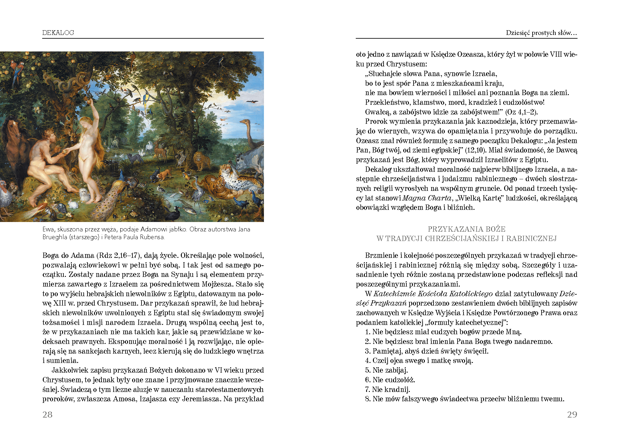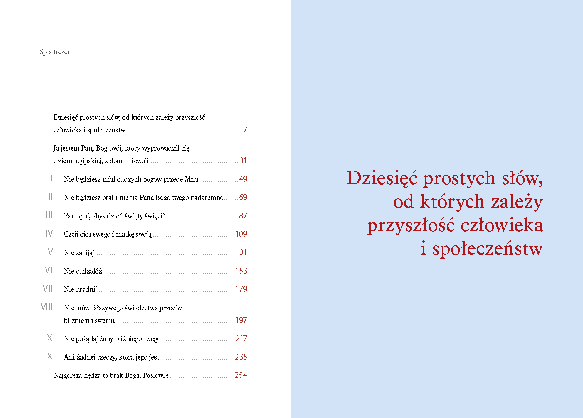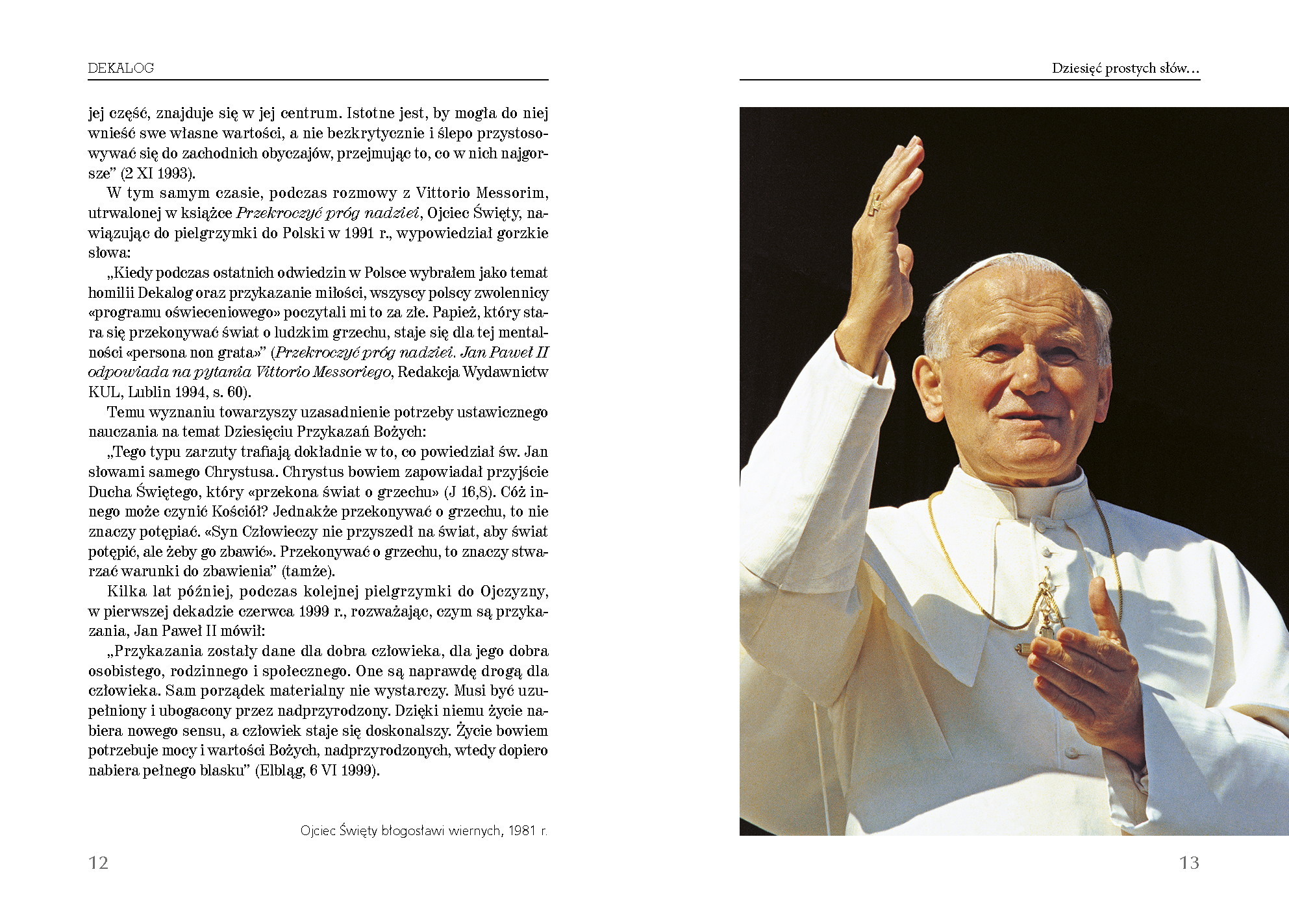 Wtych słowach, które Bóg skierował bezpośrednio do człowieka, skryta jest mądrość głęboka i uniwersalna. W obliczu mnogości praw i lawiny ustaw Dekalog przypomina nam o tym, że wystarczałoby żyć według Bożych przykazań, aby człowiek był bezpieczny i spełniony. Odkąd Bóg przekazał Mojżeszowi te nakazy na kamiennych tablicach, nie powstało już żadne lepsze prawo. Żadna konstytucja nie może się mierzyć z Boską mądrością zawartą w tych zwięzłych poleceniach. Dlatego też jest to książka niezwykle aktualna. Jest to niezbędna lektura na każdy czas i dla każdego z nas.