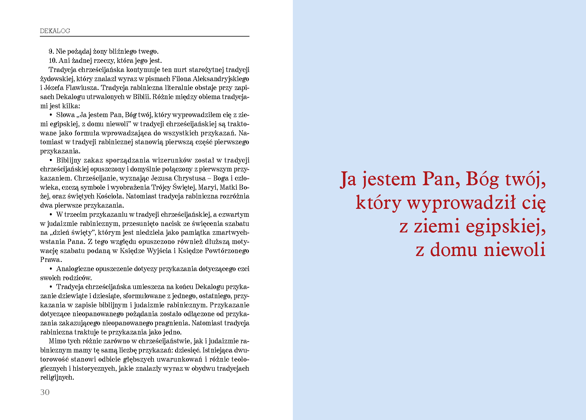 Autor pewną ręką kapłańskiego sternika prowadzi nas po kartach Biblii, dzięki czemu wiele z tego, co wcześniej wydawało się niezrozumiałe, nagle nabiera sensu. Tym bardziej, że ks. prof. Chrostowski często stosuje analogie do dnia dzisiejszego i z łatwością przenosi się ze świata starożytności do XXI wieku i odwrotnie. Objaśnia, ale i napomina, naucza i wymaga, stawia zadania współczesnemu człowiekowi. Posiłkuje się nie tylko Biblią, lecz także szczególnymi rekolekcjami, jakie do narodu polskiego głosił w 1991 r. św. Jan Paweł II podczas pielgrzymki do Ojczyzny. Program apostolskiej wizyty oparty został wówczas właśnie na analizie Dekalogu; każdy dzień poświęcony był kolejnemu przykazaniu.