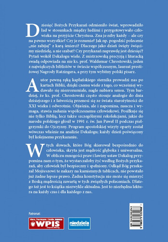 Dziesięć Bożych Przykazań odmieniło świat, wprowadziło ład w stosunkach między ludźmi i przygotowywało człowieka na przyjście Chrystusa. Zna je niby każdy – ale czy na pewno wszystkie? Czy je rozumie? Jak np. pogodzić polecenie „nie zabijaj” z karą śmierci? Dlaczego jako dzień święty święcimy niedzielę, a nie szabat? Czy przykazań naprawdę jest dziesięć? Pytań wokół Dekalogu wiele. Z mistrzowską precyzją i literacką swadą odpowiada na nie ks. prof. Waldemar Chrostowski, jeden z największych biblistów w świecie współczesnym, laureat prestiżowej Nagrody Ratzingera, a przy tym wybitny polski pisarz.