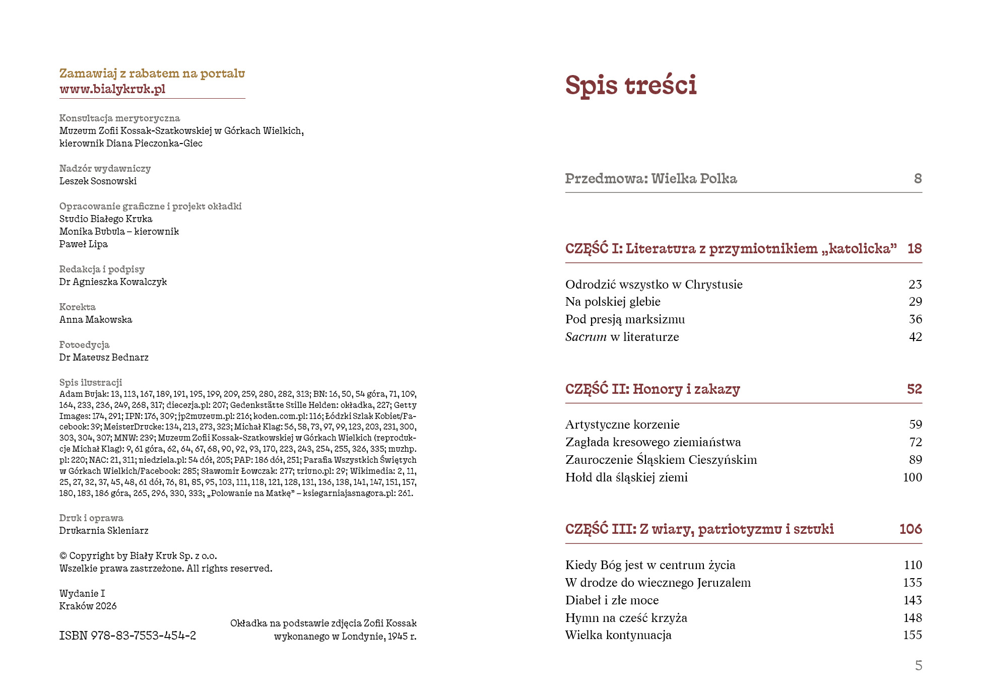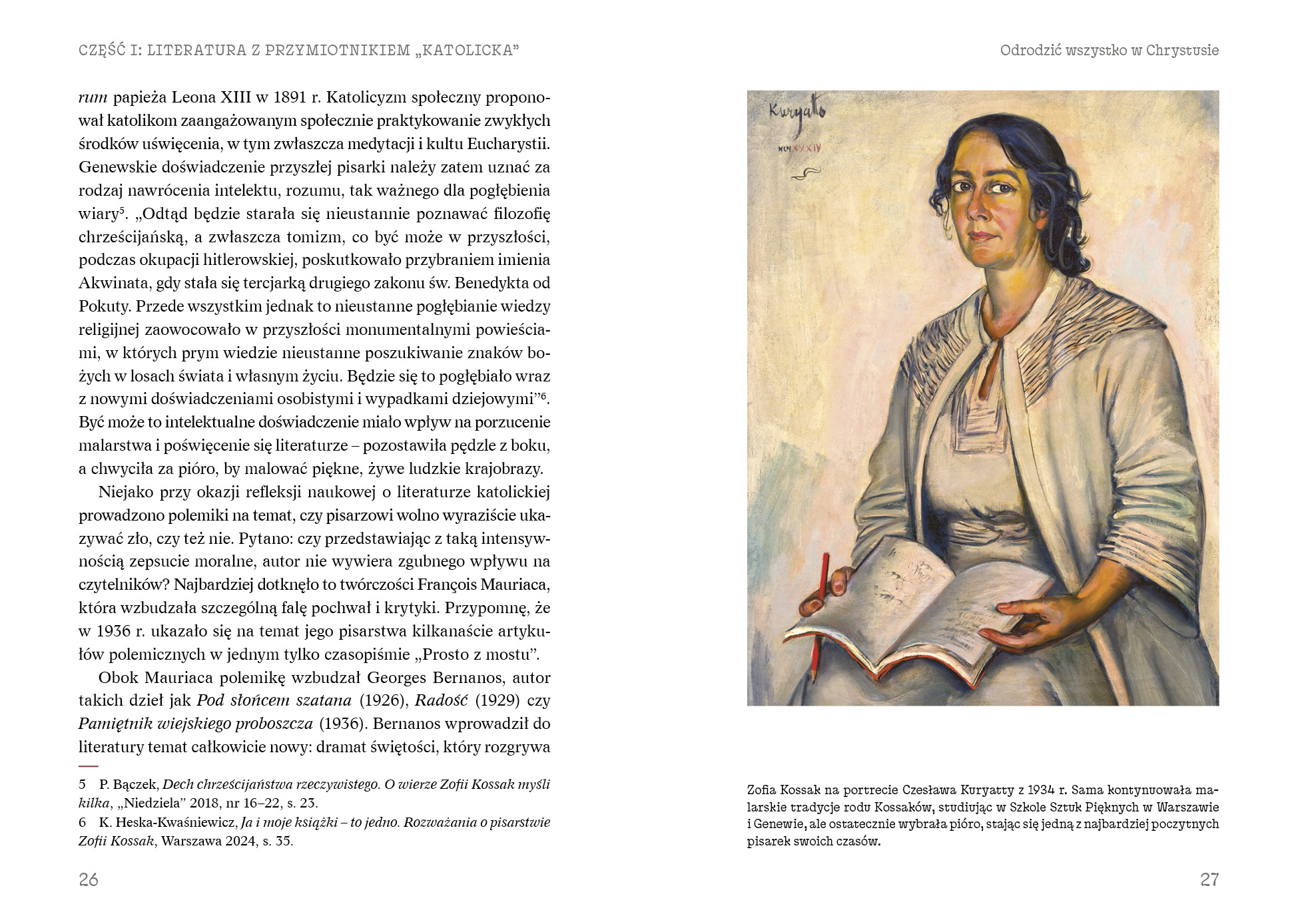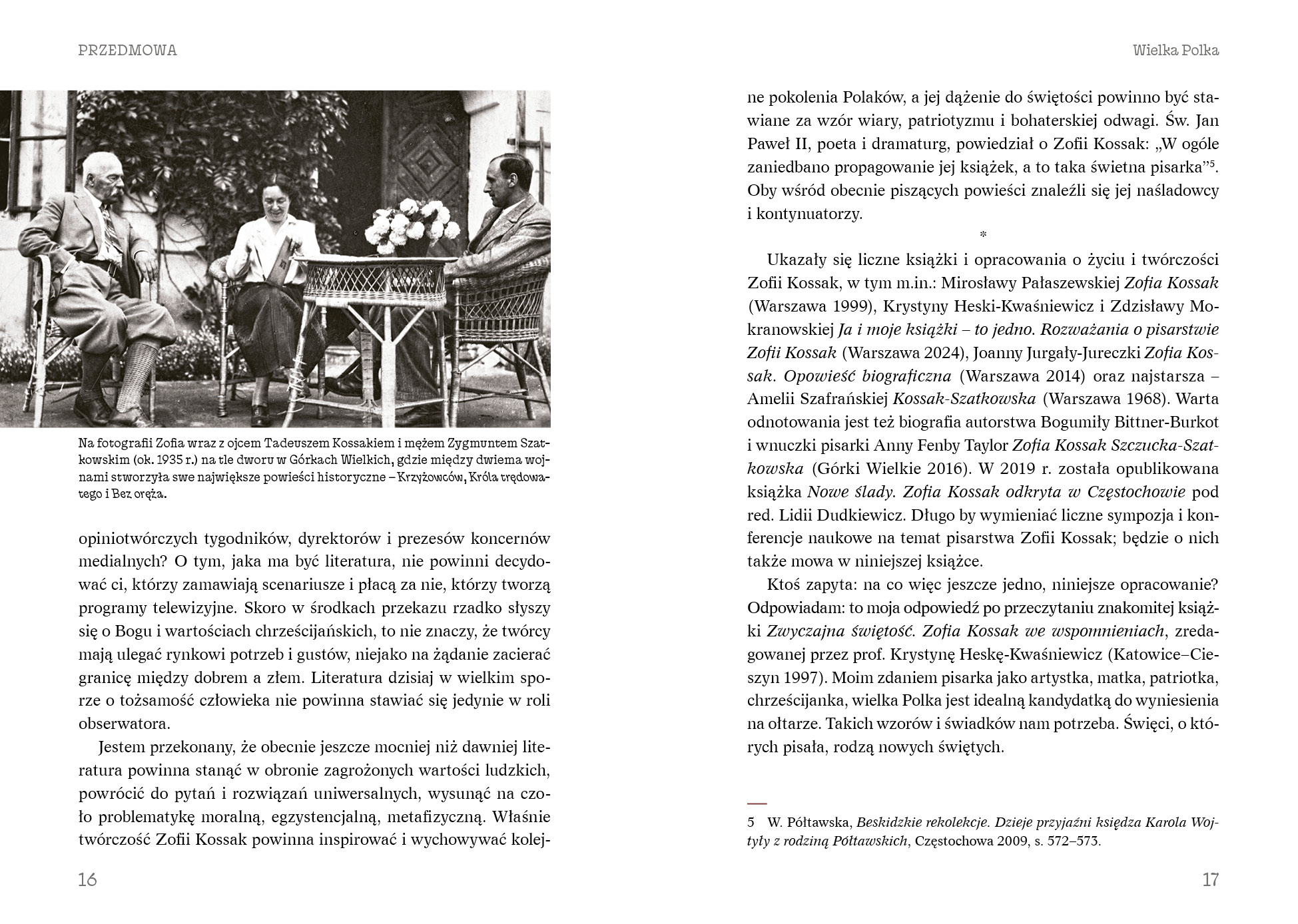 Przy okazji pracy nad tą monografią dotarłem do informacji, że na wspomnianym katolickim uniwersytecie Zofia Kossak przed wojną w czasie spotkania ze studentami, mówiąc o Piotrze Skardze, sformułowała ważną myśl: „My wszyscy zwani katolikami z dreszczem grozy uprzytomnijmy sobie, że być dobrym katolikiem – to być świętym”1. Wracam do tych słów obecnie, przygotowując tę monografię dla wydawnictwa Biały Kruk w Krakowie. Stwierdzenie, że katolik piszący książki ma być świętym, brzmi jak wyzwanie, może dla kogoś nieco dewocyjnie, ale nie dla Zofii Kossak, która w swoim pisarstwie widziała tajemnicze powinowactwo z wiarą, z religią. Cóż, żyła w czasach, w których tworzono wielkie rozprawy na temat powołania literatury, a pisarza porównywano do człowieka rzucającego pierwiastki boskie między ludzi. Prawdziwa literatura – jak uważał Daniel-Rops – otwiera się na wielkoduszną afirmację życia i wszystkiego, co jest widzialne i niewidzialne2.