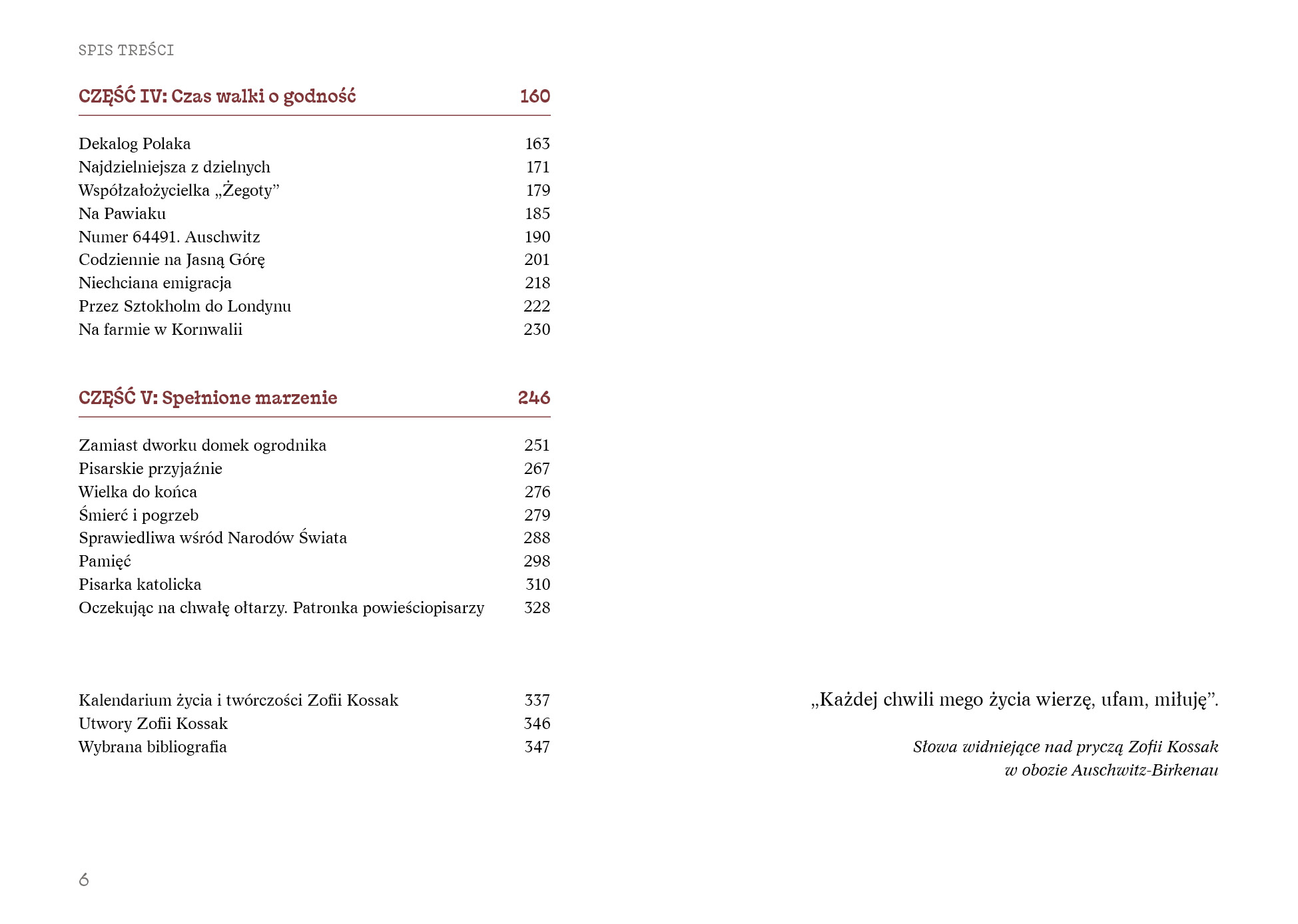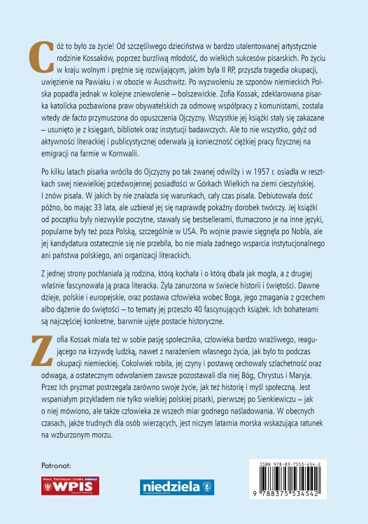 Cóż to było za życie! Od szczęśliwego dzieciństwa w bardzo utalentowanej artystycznie rodzinie Kossaków, poprzez burzliwą młodość, do wielkich sukcesów pisarskich. Po życiu w kraju wolnym i prężnie się rozwijającym, jakim była II RP, przyszła tragedia okupacji, uwięzienie na Pawiaku i w obozie w Auschwitz. Po wyzwoleniu ze szponów niemieckich Polska popadła jednak w kolejne zniewolenie – bolszewickie. Zofia Kossak, zdeklarowana pisarka katolicka pozbawiona praw obywatelskich za odmowę współpracy z komunistami, została wtedy de facto przymuszona do opuszczenia Ojczyzny. Wszystkie jej książki stały się zakazane – usunięto je z księgarń, bibliotek oraz instytucji badawczych. Ale to nie wszystko, gdyż od aktywności literackiej i publicystycznej oderwała ją konieczność ciężkiej pracy fizycznej na emigracji na farmie w Kornwalii.
