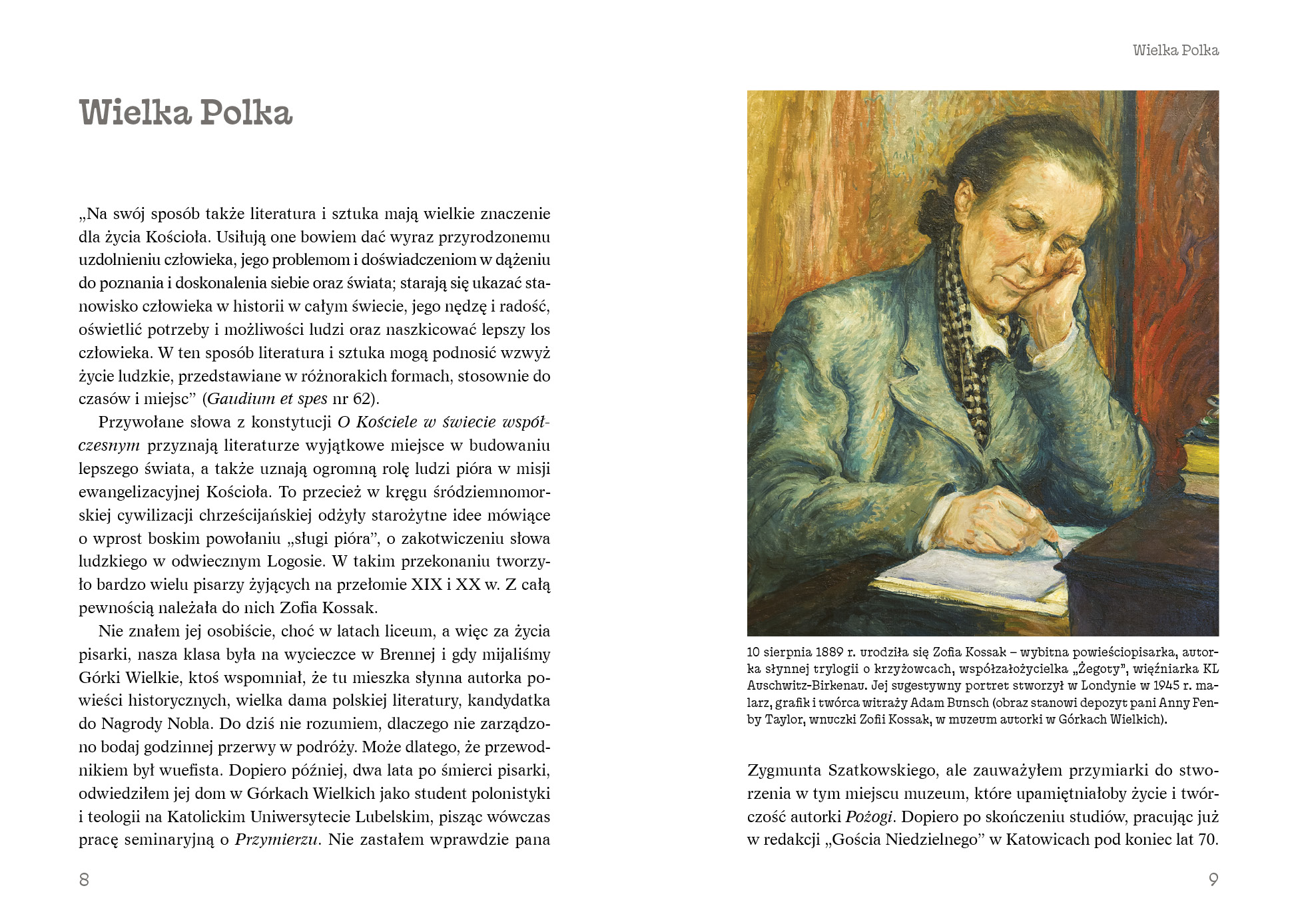 Przywołane słowa z konstytucji O Kościele w świecie współczesnym przyznają literaturze wyjątkowe miejsce w budowaniu lepszego świata, a także uznają ogromną rolę ludzi pióra w misji ewangelizacyjnej Kościoła. To przecież w kręgu śródziemnomorskiej cywilizacji chrześcijańskiej odżyły starożytne idee mówiące o wprost boskim powołaniu „sługi pióra”, o zakotwiczeniu słowa ludzkiego w odwiecznym Logosie. W takim przekonaniu tworzyło bardzo wielu pisarzy żyjących na przełomie XIX i XX w. Z całą pewnością należała do nich Zofia Kossak.