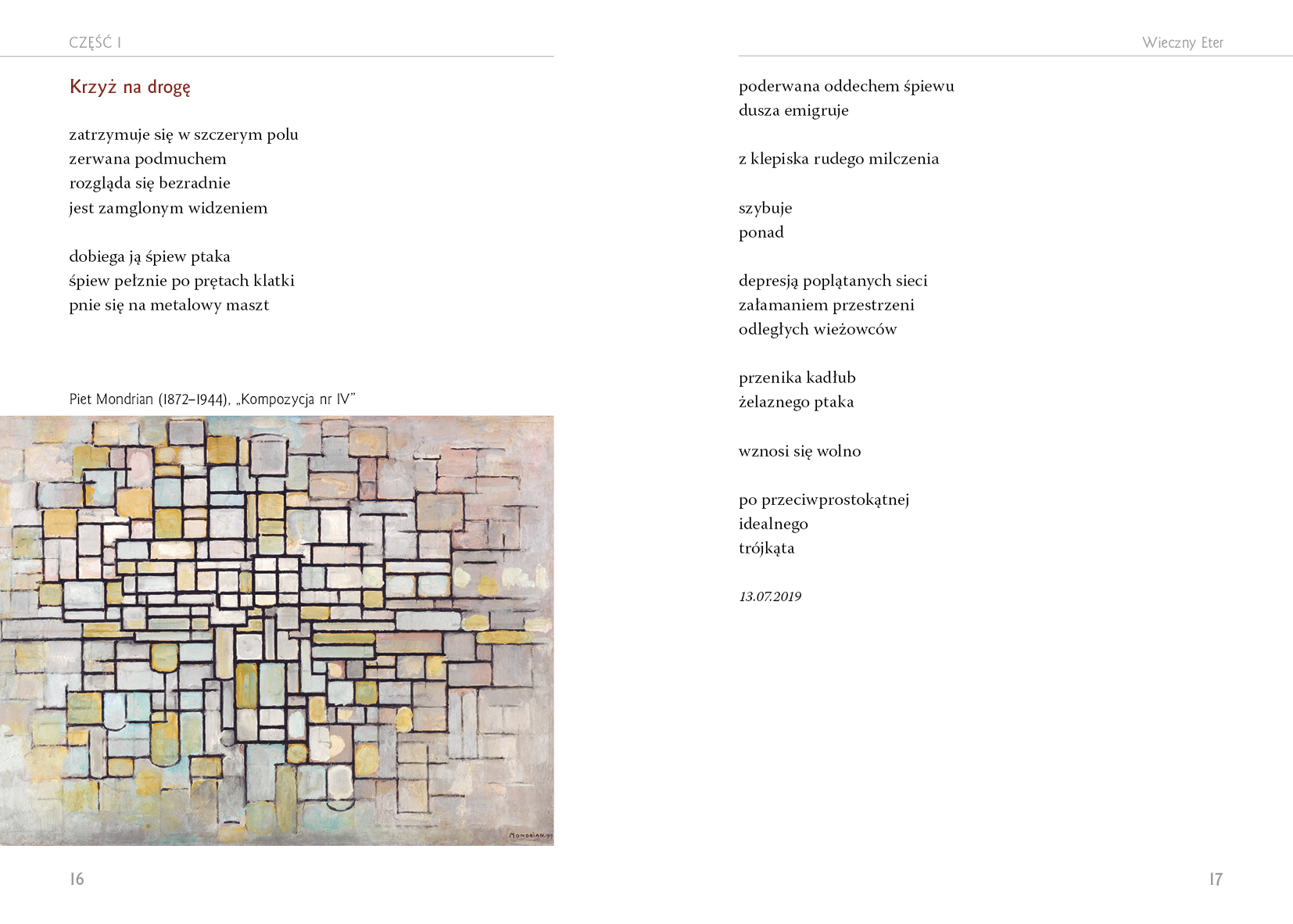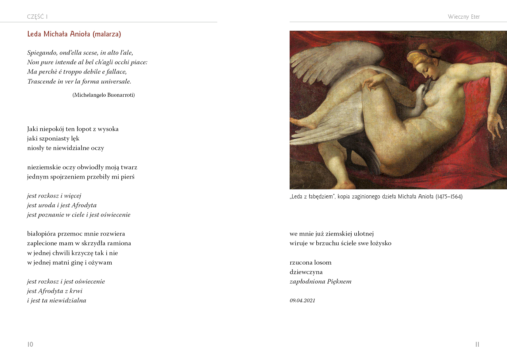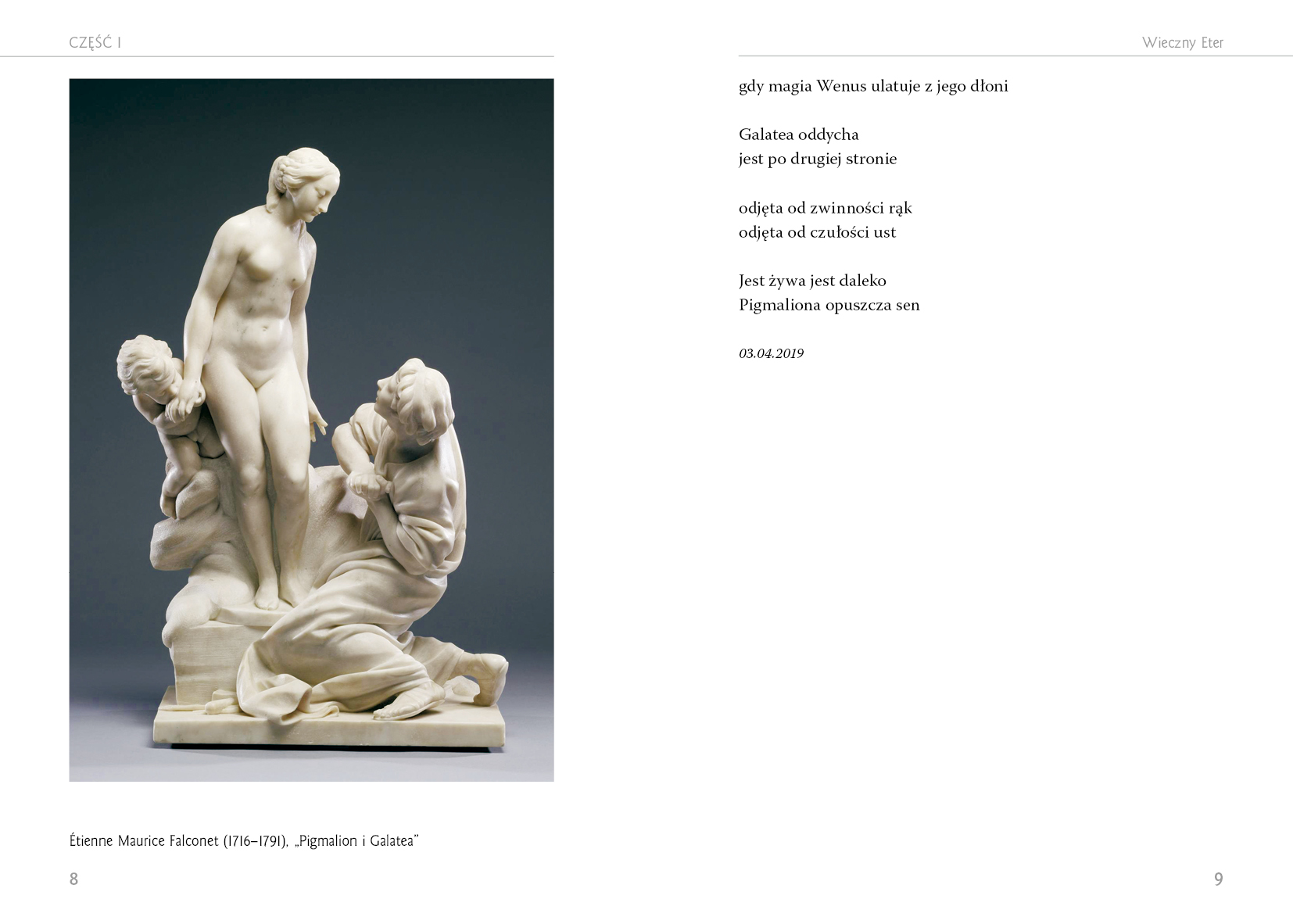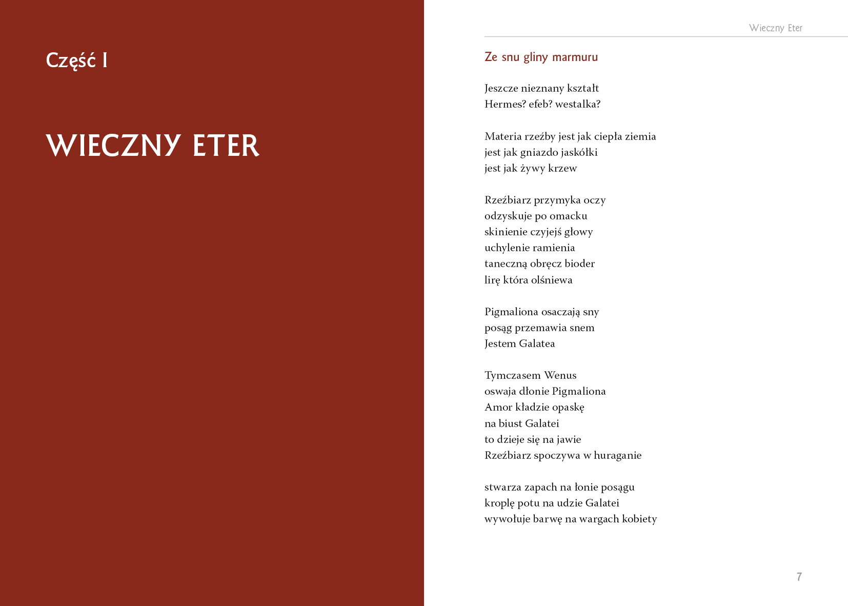 W pierwszej części tomu (Wieczny Eter) znajdują się zarówno erotyki i utwory nawiązujące do mitologii greckiej, jak i wiersze skupiające się na poezji samej w sobie, na jej tworzeniu, lub uwypuklające motyw niepokoju, a nawet cierpienia.