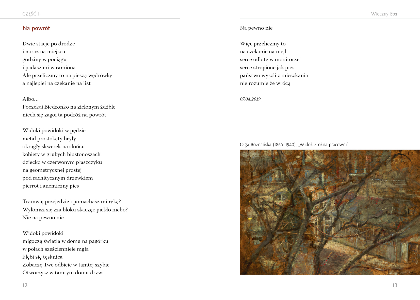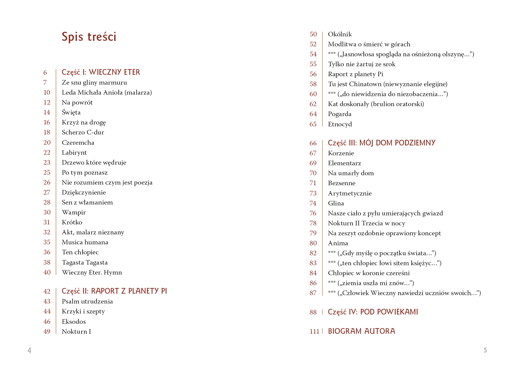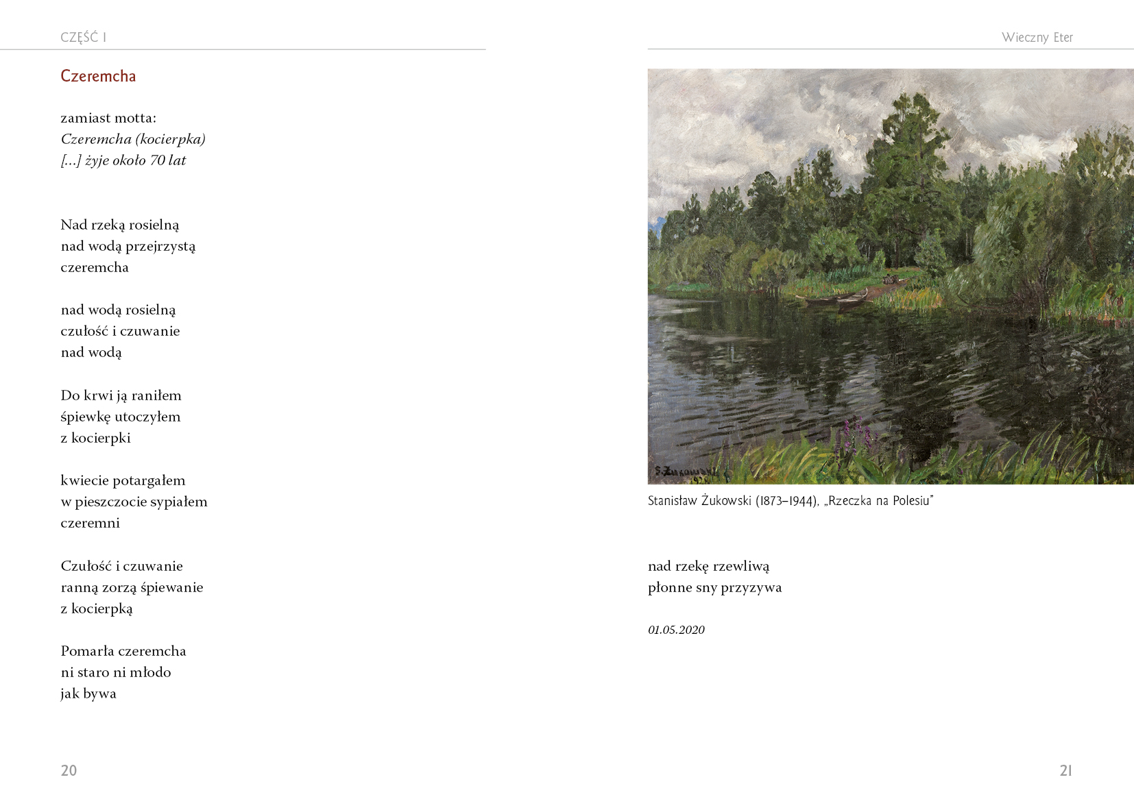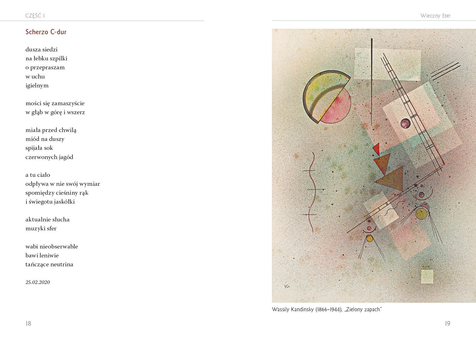 W pierwszej części tomu (Wieczny Eter) znajdują się zarówno erotyki i utwory nawiązujące do mitologii greckiej, jak i wiersze skupiające się na poezji samej w sobie, na jej tworzeniu, lub uwypuklające motyw niepokoju, a nawet cierpienia.