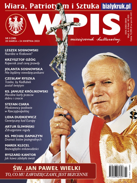 Pojawił się już najnowszy, marcowy numer miesięcznika „Wpis”. Jak każdego miesiąca przygotowaliśmy dla Państwa serię wyselekcjonowanych felietonów poświęconych aktualnym zagadnieniom, jak również cały cykl artykułów na tematy historyczne powiązane z bieżącymi rocznicami. W związku z brutalnymi atakami na świętego Jana Pawła II i jego pamięć nie mogło zabraknąć artykułu Jolanty Sosnowskiej. Autorka znakomitej biografii niezapomnianego papieża Polaka, w wielkim stylu staje w jego obronie, przedstawiając niezbite dowody na to, iż wszelkie nachalnie nagłaśniane w mediach oszczerstwa są jedynie elementem brudnej kampanii propagandowej, mającej na celu zniszczenie wizerunku jednego z najwybitniejszych Polaków w historii. Prezentujemy także tekst Leszka Sosnowskiego, w którym autor dokonuje błyskotliwej analizy tego, co łączy (albo co powinno, a co nie powinno łączyć) sport i politykę. Pamiętaliśmy także o najwybitniejszym polskim astronomie – Mikołaju Koperniku (był specjalistą także w wielu innych dziedzinach), którego rok obchodzimy. W związku z tym prezentujemy tekst świetnego znawcy średniowiecznych dziejów Polski – prof. Krzysztofa Ożoga. Zamieszczamy także artykuły na aktualne tematy; o fatalnej kondycji moralnej dzisiejszej Europy i świata i o możliwościach zaradzenia temu stanowi rzeczy piszą ks. prof. Janusz Królikowski i red. Lidia Dudkiewicz. Utrzymany w podobnym tonie tekst ks. prof. Macieja Sieniatyckiego z... 1916 r. brzmi zadziwiająco aktualnie. Prezentujemy także urokliwe wiersze pasyjno-wielkanocne autorstwa dr Justyny Chłap-Nowakowej i ks. Stefana Misińca, jak również pasyjny tekst o warszawskich wizerunkach cierpiącego Zbawiciela, których dzieje w zadziwiający sposób połączyły się z historią walczącej stolicy... Marcowy „Wpis” to ponad 120 stron frapującej lektury!