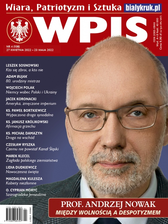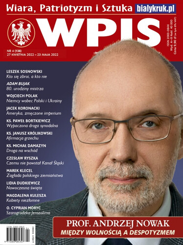 Pojawił się już kwietniowy numer miesięcznika „Wpis”, a w nim jak zwykle – wyselekcjonowany zbiór felietonów na aktualne tematy polityczno-społeczne, a także seria artykułów historycznych powiązanych z bieżącymi rocznicami. W związku z promocją najnowszej książki wybitnego polskiego historyka prof. Andrzeja Nowaka („Polska i Rosja”) nie mogło zabraknąć reportażu z uroczystej gali w hali krakowskiego „Sokoła”. Poza znakomitym Autorem w wydarzeniu wzięli też udział tak świetni znawcy tematu relacji polsko-rosyjskich jak prof. Wojciech Polak i prof. Wojciech Roszkowski. Całość prowadziła utalentowana dziennikarka Anna Popek, zaś oprawę zapewnili aktor Jerzy Zelnik oraz śpiewak Jan Kowalczyk i jego akompaniator Ziemowit Pawlisz. Zamieszczamy także, rzecz jasna, błyskotliwą analizę historycznych i obecnych relacji pomiędzy Polską i Rosją, czyli sąsiedztwa wolności i despotyzmu, dokonaną przez prof. Andrzeja Nowaka. Z kolei prof. Wojciech Polak prezentuje opis obecnej polityki Niemiec zarówno wobec Polski, jak i wobec wojny na Ukrainie. Historię i obecną sytuację USA analizuje z kolei prof. Jacek Koronacki, zaś ks. prof. Janusz Królikowski wyjaśnia, dlaczego grzech stał się spektakularny i potrafi się atrakcyjnie „sprzedać” oraz w jaki sposób należy sobie radzić z tym niebezpieczeństwem. Nie brakuje także artykułu znakomitego publicysty Leszka Sosnowskiego, który podkreśla, że wojny toczą się nie tylko na płaszczyźnie walki zbrojnej, ale i w mediach – bez tych ostatnich zresztą zwycięstwa nie ma, nawet wówczas, kiedy dysponujemy przewagą w sprzęcie i ludziach. Kwietniowy „Wpis” to ponad 120 stron porywającej lektury!