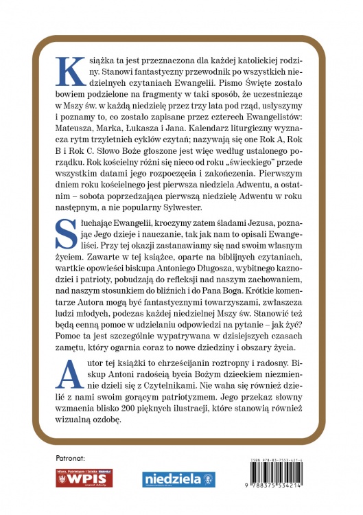Słuchając Ewangelii, kroczymy zatem śladami Jezusa, poznając Jego dzieje i nauczanie, tak jak nam to opisali Ewangeliści. Przy tej okazji zastanawiamy się nad swoim własnym życiem. Zawarte w tej książce, oparte na biblijnych czytaniach, wartkie opowieści biskupa Antoniego Długosza, wybitnego kaznodziei i patrioty, pobudzają do refleksji nad naszym zachowaniem, nad naszym stosunkiem do bliźnich i do Pana Boga. Krótkie komentarze Autora mogą być fantastycznymi towarzyszami, zwłaszcza ludzi młodych, podczas każdej niedzielnej Mszy św. Stanowić też będą cenną pomoc w udzielaniu odpowiedzi na pytanie – jak żyć? Pomoc ta jest szczególnie wypatrywana w dzisiejszych czasach zamętu, który ogarnia coraz to nowe dziedziny i obszary życia.